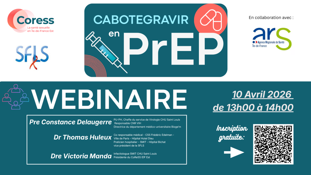 La SFLS, le CoReSS Ile-de-France Est, en collaboration avec l’ARS Ile-de-France organise un webinaire « Cabotagravir en PrEP » le vendredi 10 avril 2026 de 13h à 14h.